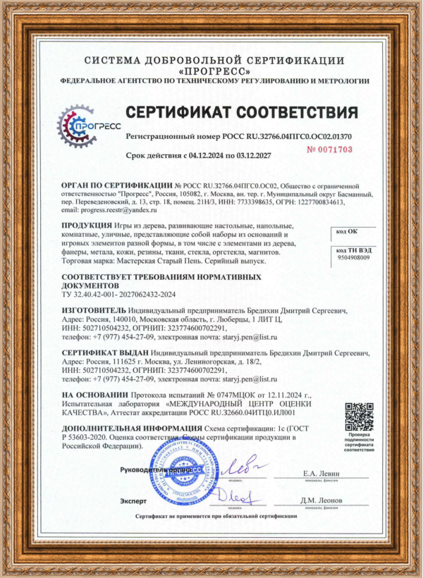 «Мастерская Старый Пень» является официальным участником системы государственных и муниципальных закупок. Вся продукция имеет необходимую разрешительную документацию, соответствует установленным техническим условиям (ТУ) и прошла процедуру обязательной оценки соответствия. Мы обеспечиваем надежную упаковку и организованную доставку готовых изделий по всей территории Российской Федерации. Таким образом, мы предлагаем комплексное решение: от разработки дизайна и производства игр из отборных материалов до их поставки конечному заказчику, будь то частное лицо, коммерческая организация или государственное учреждение.